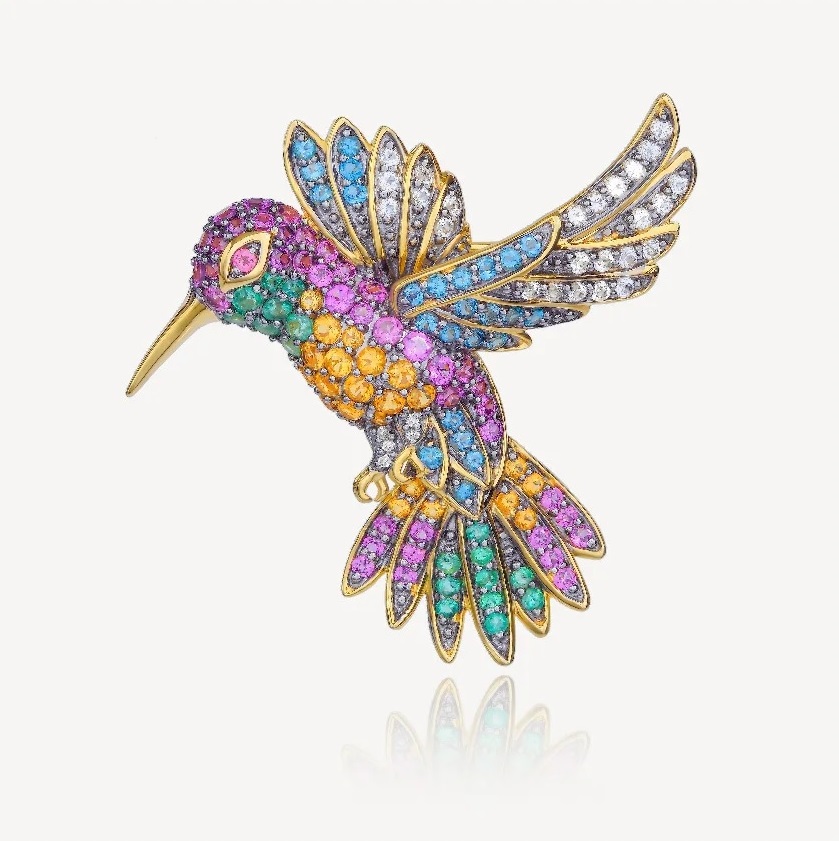 Брошь из серебра c бриллиантами, изумрудами, топазами, родолитом и цитрином