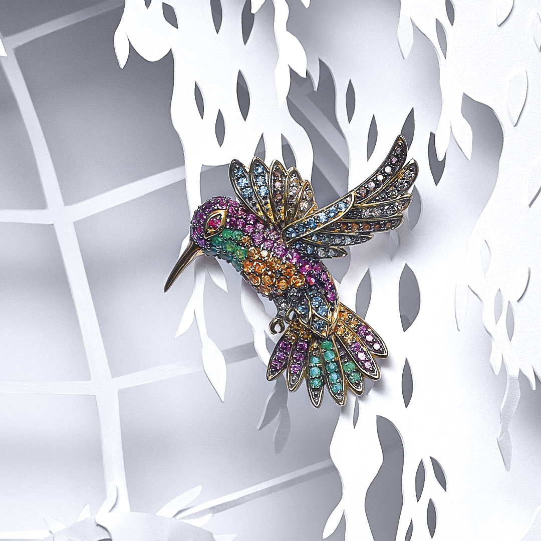Брошь из серебра c бриллиантами, топазами, аметистами, гранатом, родолитом, турмалином и шпинелью
