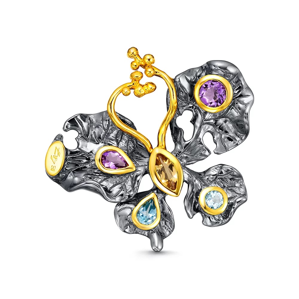 Брошь из серебра c топазами, аметистами и цитрином