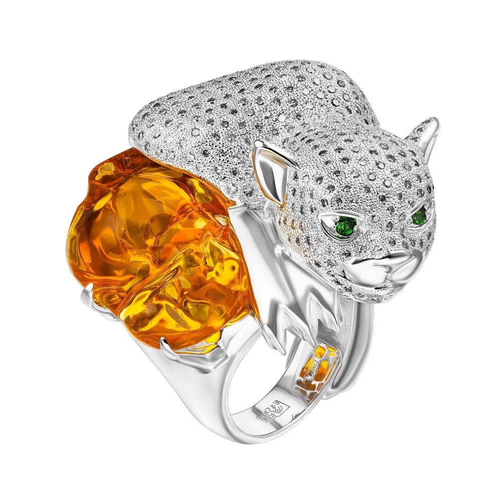 Кольцо из белого золота c бриллиантами, опалом и тсаворитом