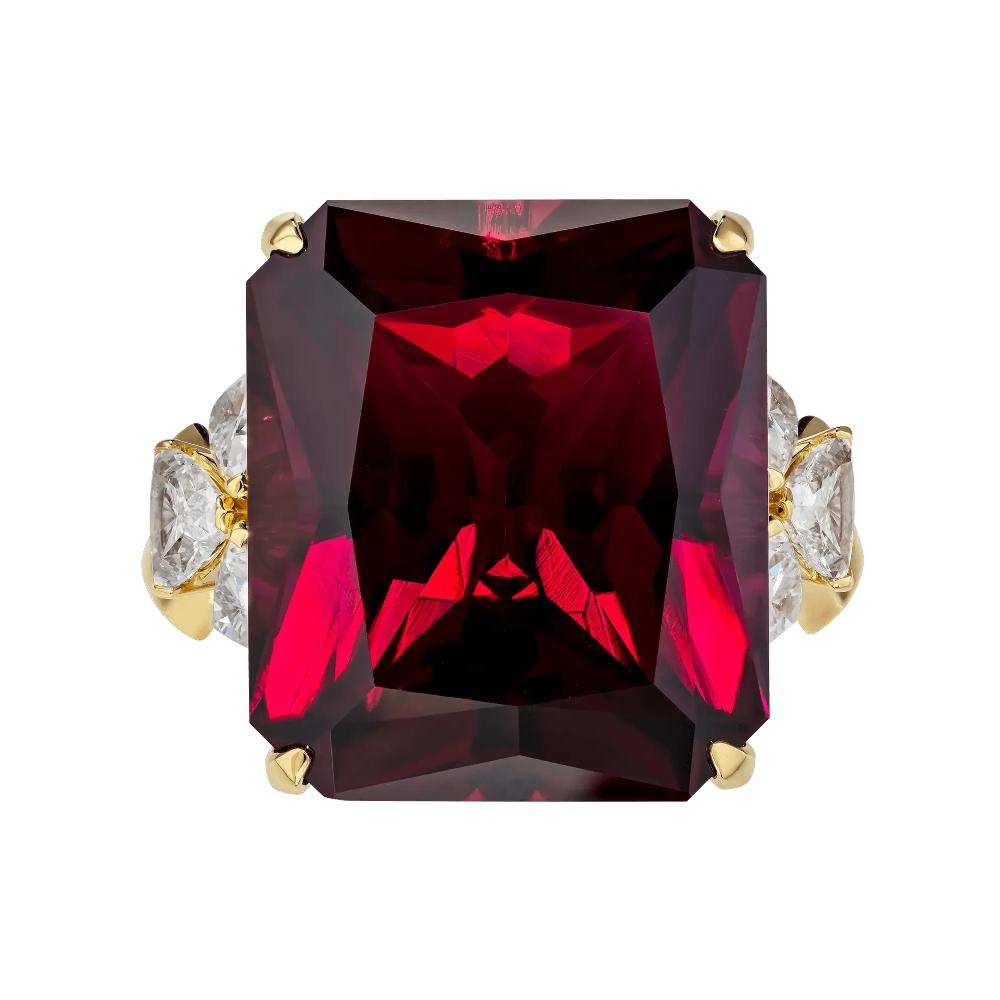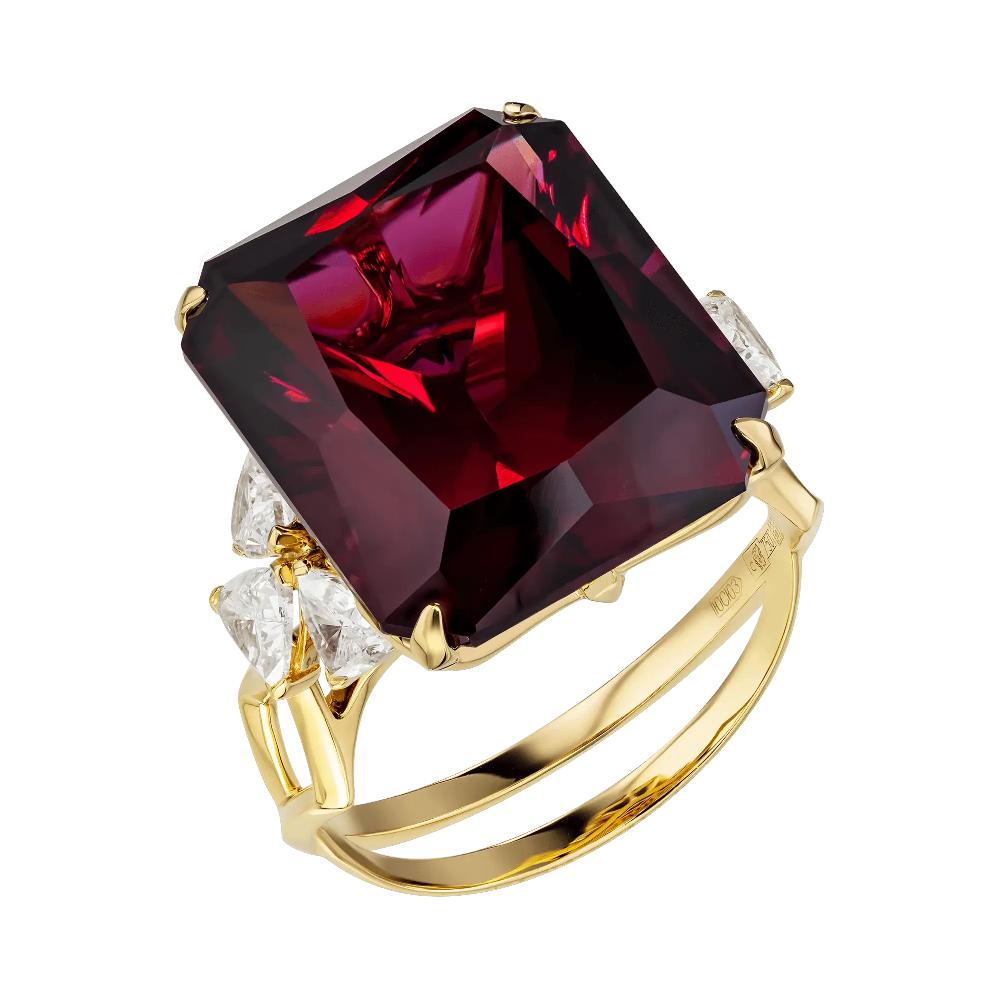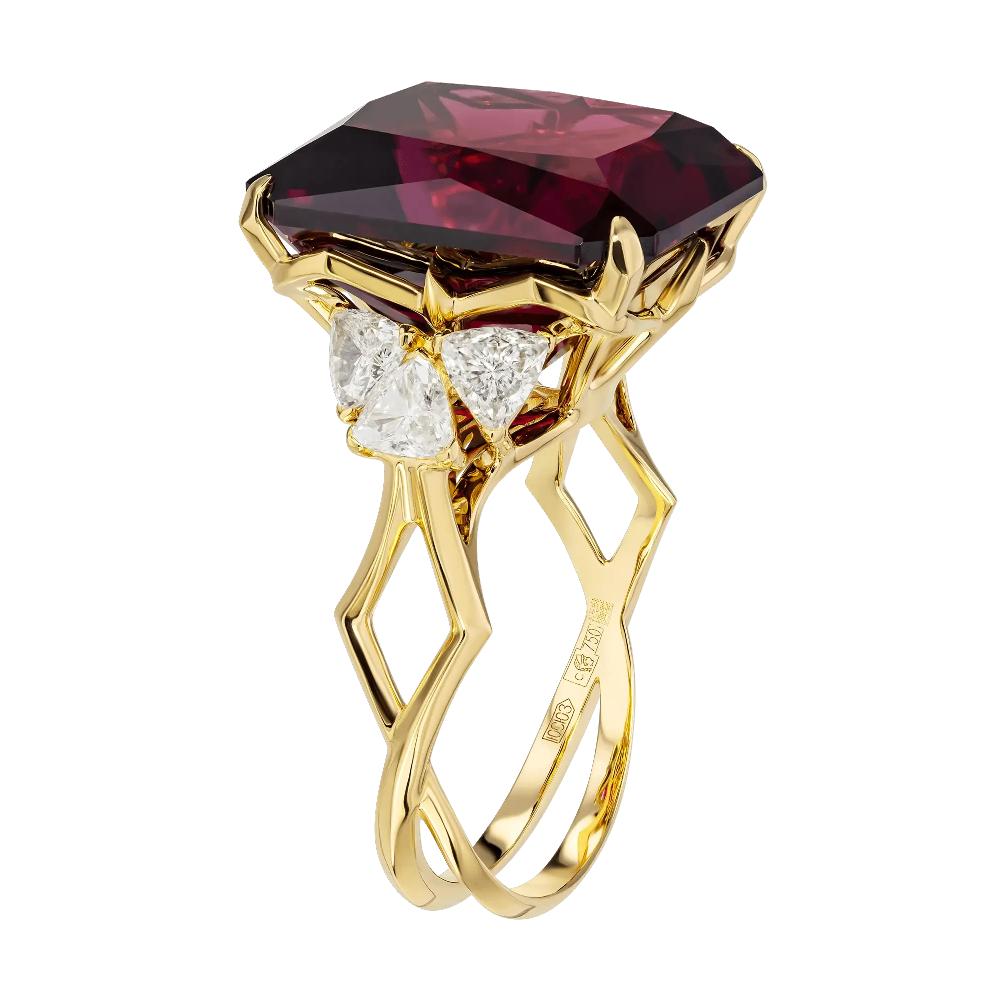 Кольцо из желтого золота c бриллиантами и родолитом