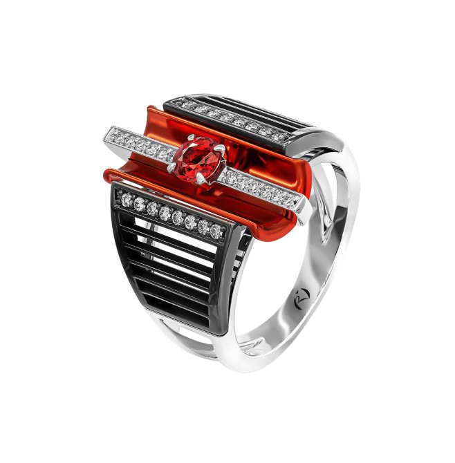 Кольцо из белого золота c бриллиантами, родолитом и танзанитом