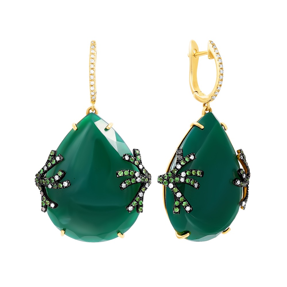 Серьги из желтого золота c бриллиантами, агатом и тсаворитом