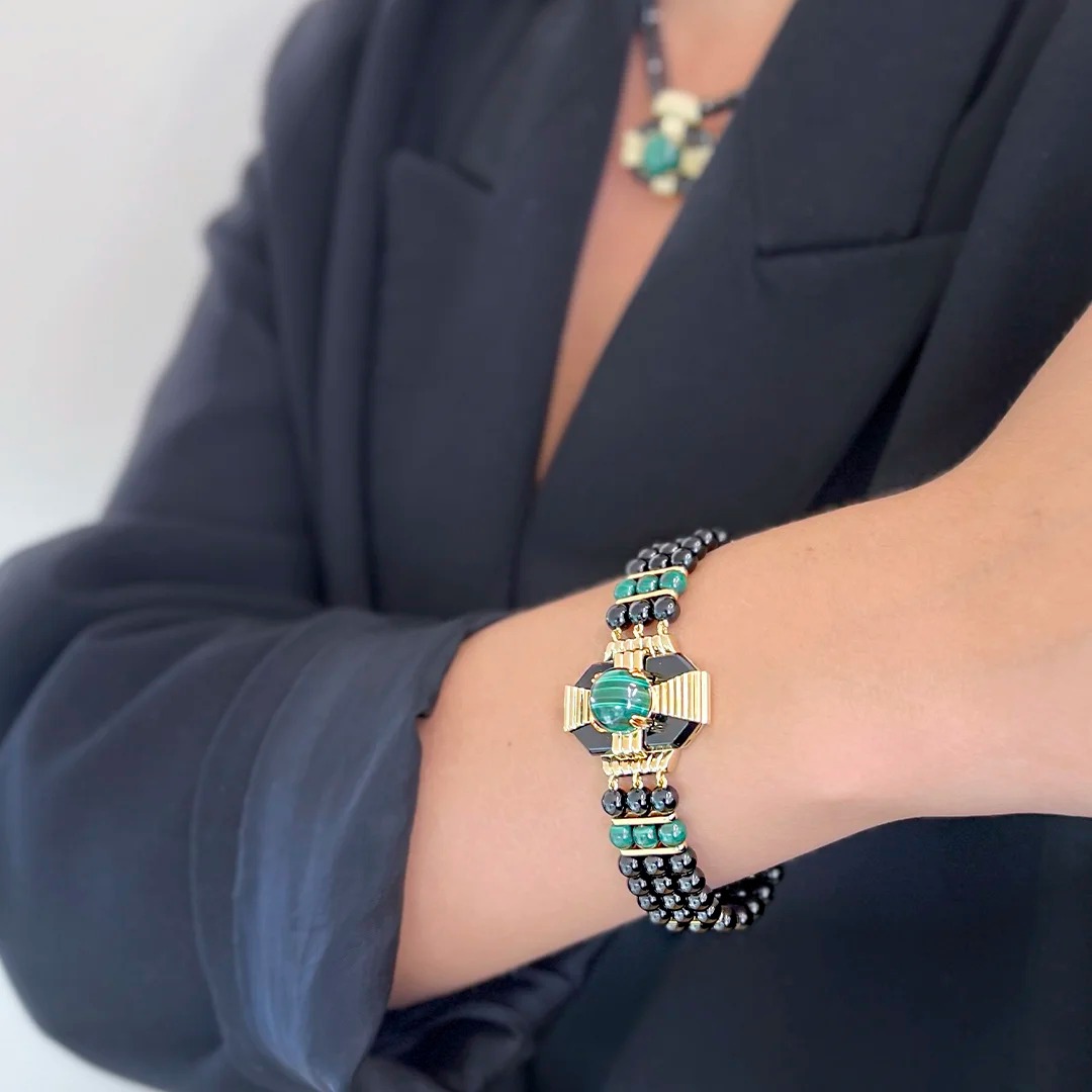 Колье из серебра c агатом, малахитом и ониксом
