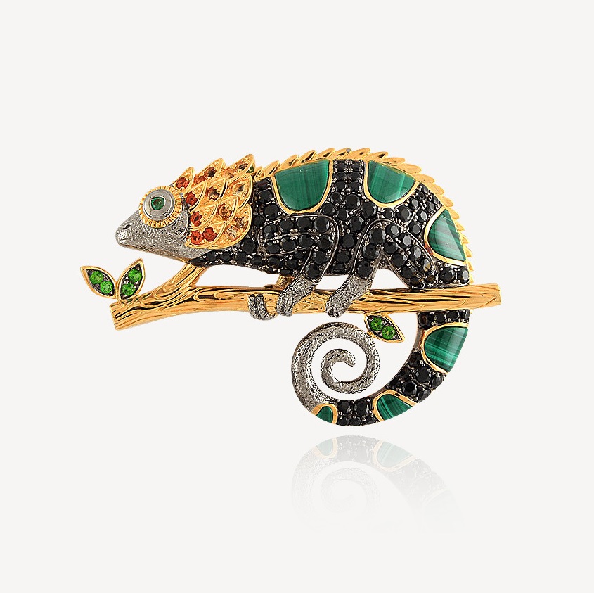 Брошь из серебра c изумрудами, малахитом, цитрином и шпинелью