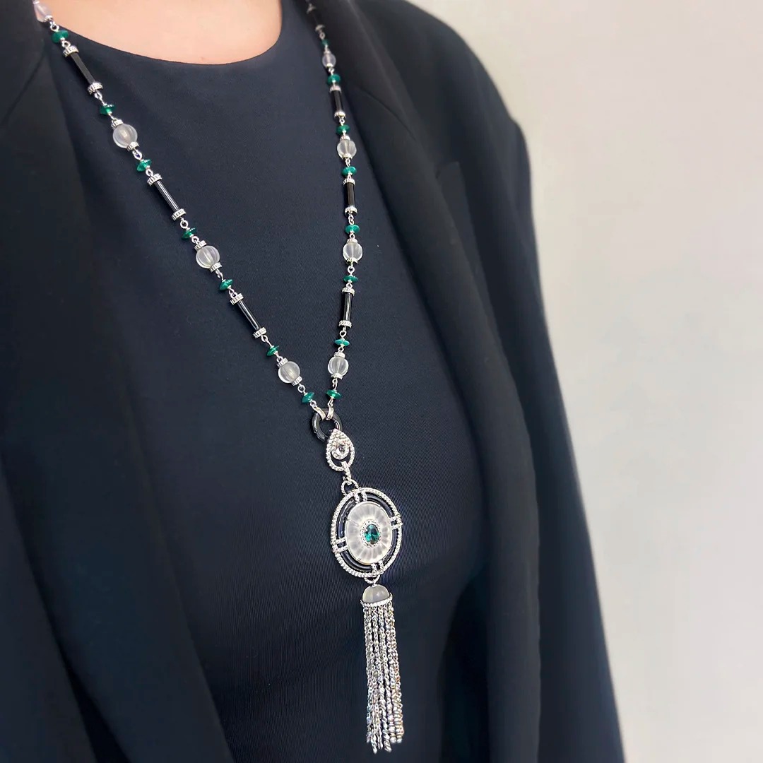 Колье из серебра c изумрудами, агатом и горным хрусталем