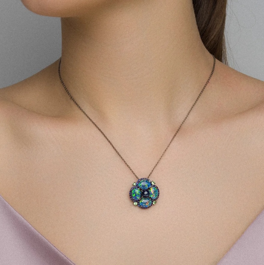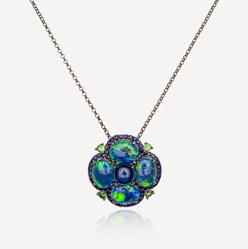 Колье из серебра c сапфирами, опалом и тсаворитом