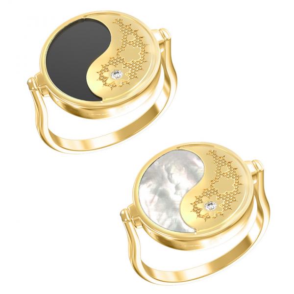 Кольцо из желтого золота c фианитами, ониксом и перламутром