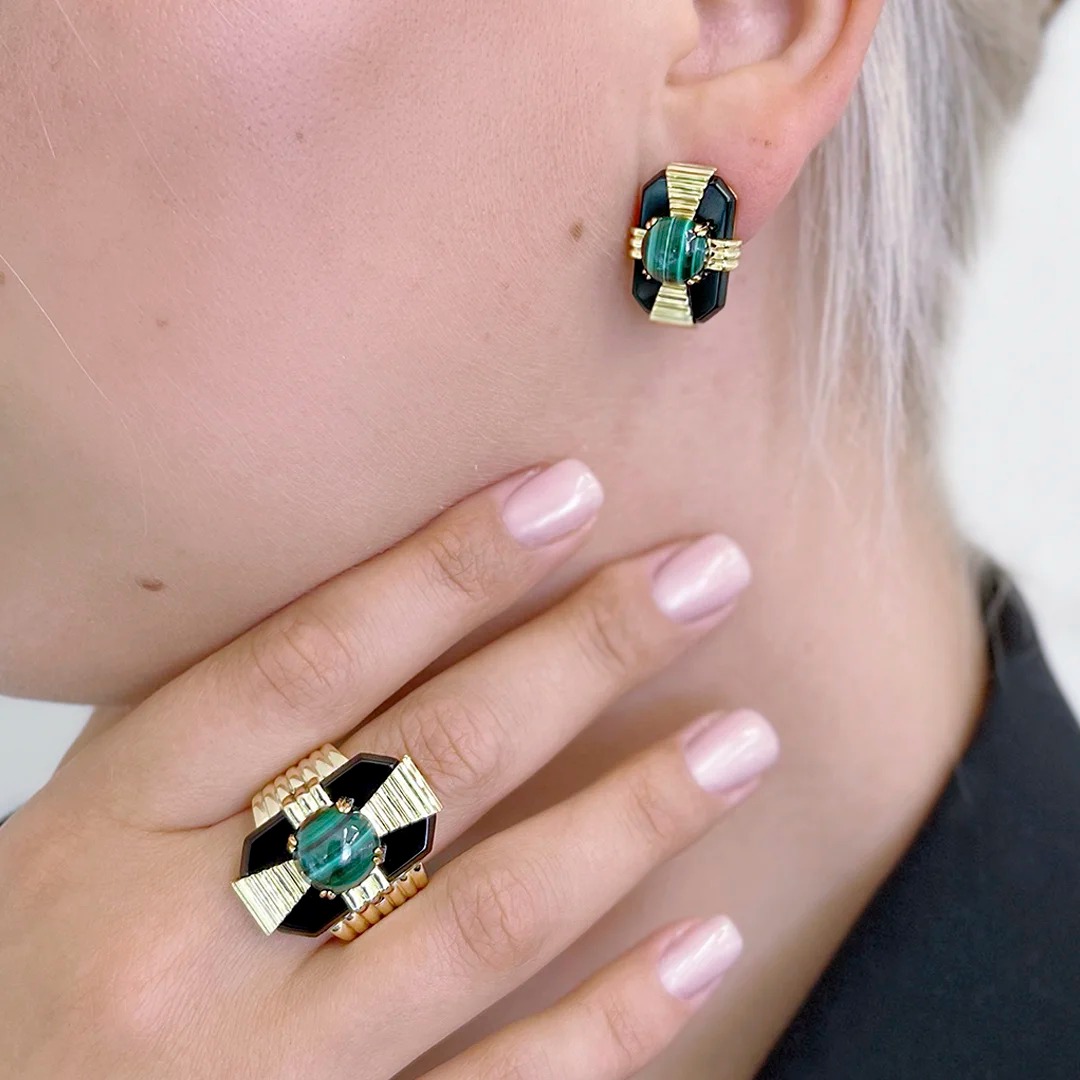 Кольцо из серебра c малахитом и ониксом