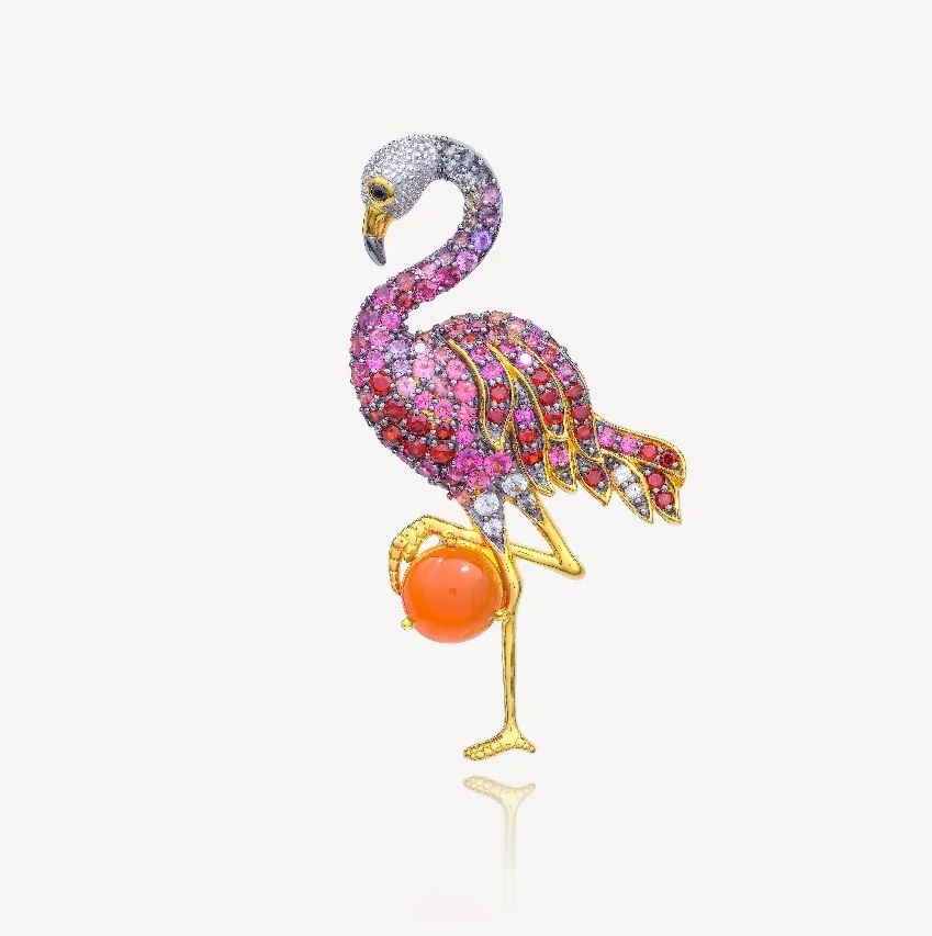 Брошь из серебра c бриллиантами, кварцем, цитрином и шпинелью