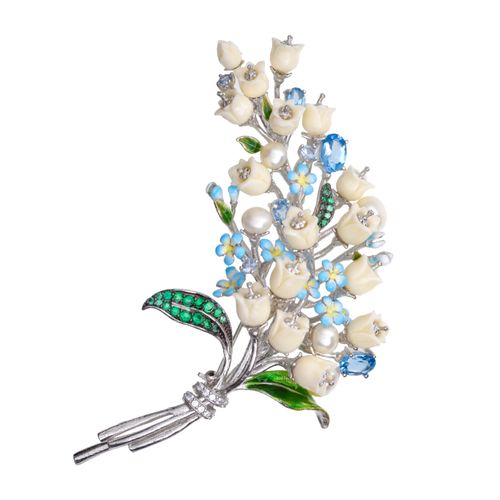 Брошь из серебра c жемчугом, топазами, фианитами, кораллами и эмалью