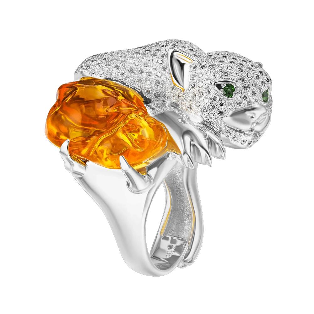Кольцо из белого золота c бриллиантами, опалом и тсаворитом
