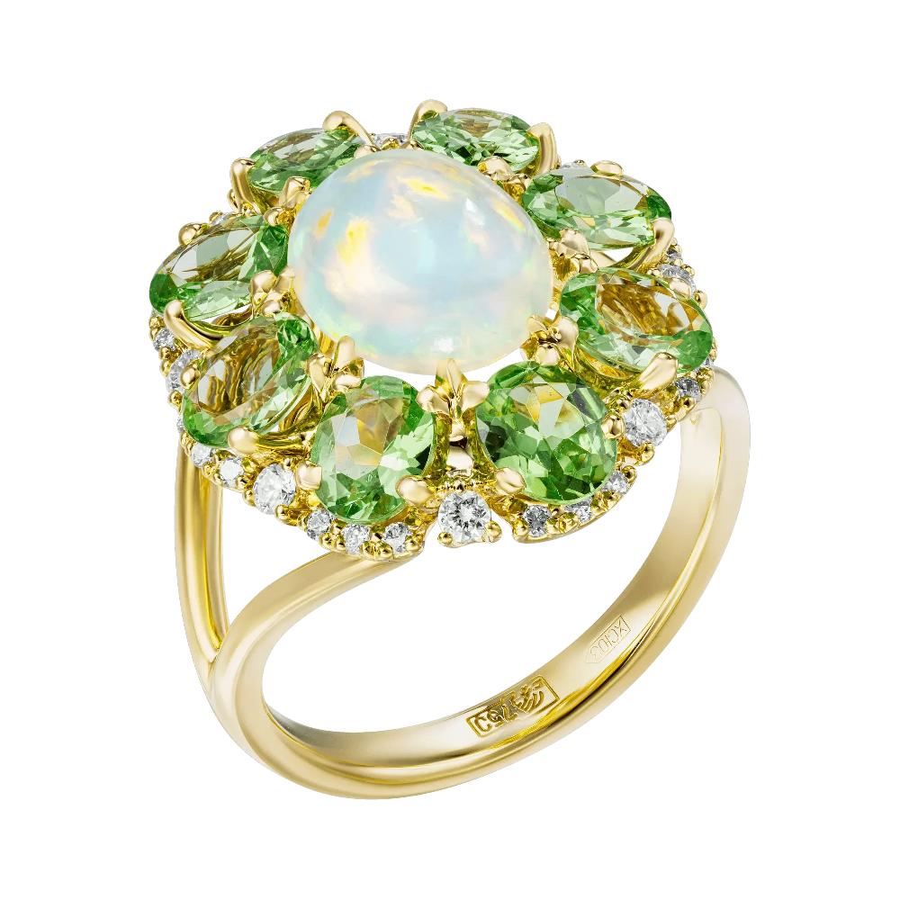 Кольцо из желтого золота c бриллиантами, опалом и тсаворитом