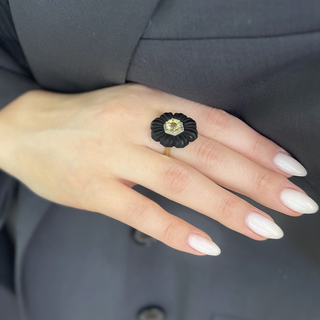 | Вставка | 24 Бриллианта, огранка круглая, граней 17, 3/3, вес 0,1; Цитрин; Обсидиан; Родий; Позолота |