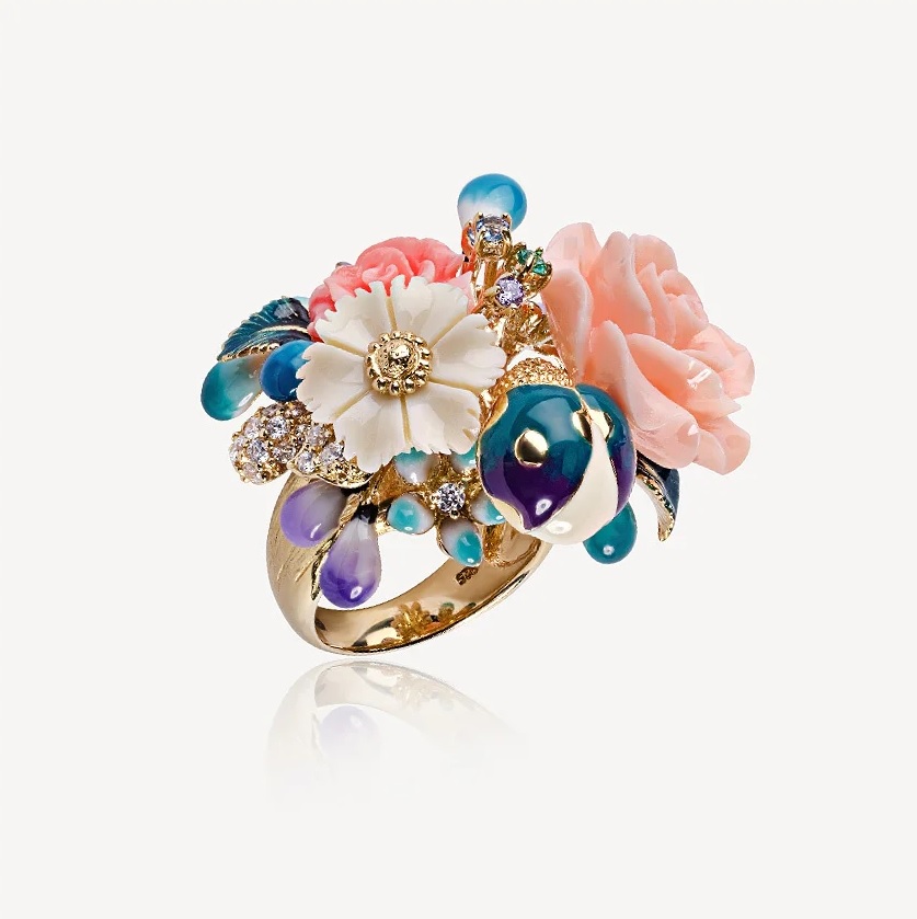 Кольцо из серебра c фианитами, кораллами и эмалью