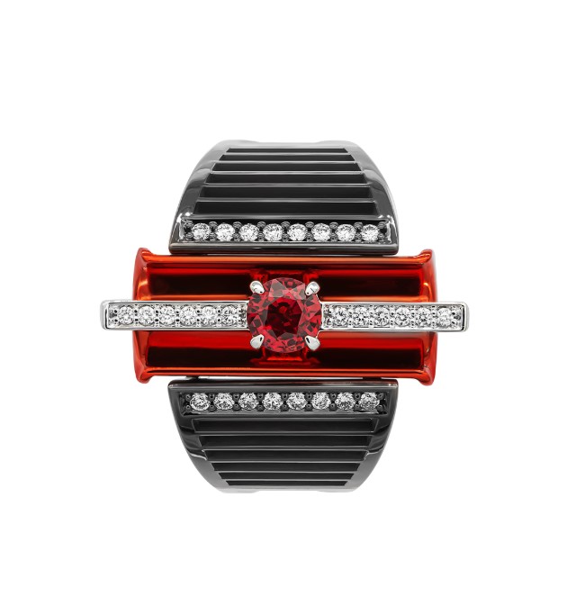 Кольцо из белого золота c бриллиантами, родолитом и танзанитом