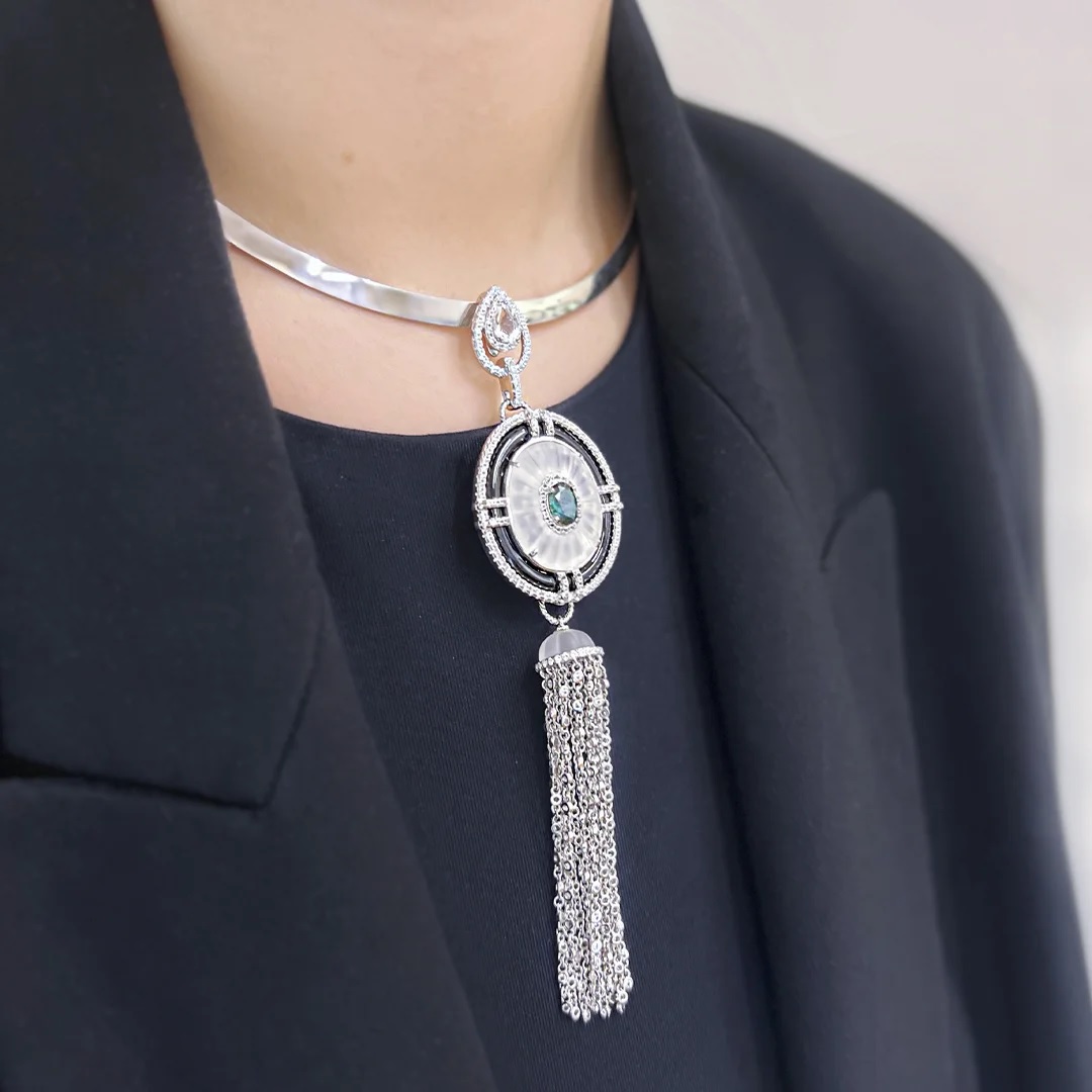 Колье из серебра c изумрудами, агатом и горным хрусталем
