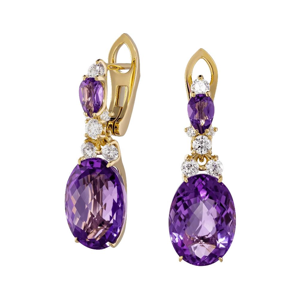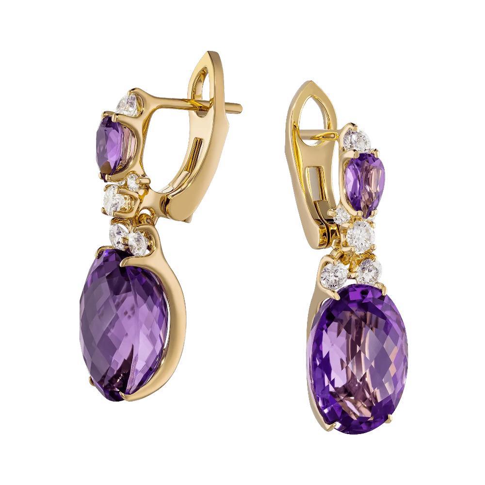 Серьги из желтого золота c бриллиантами и аметистами