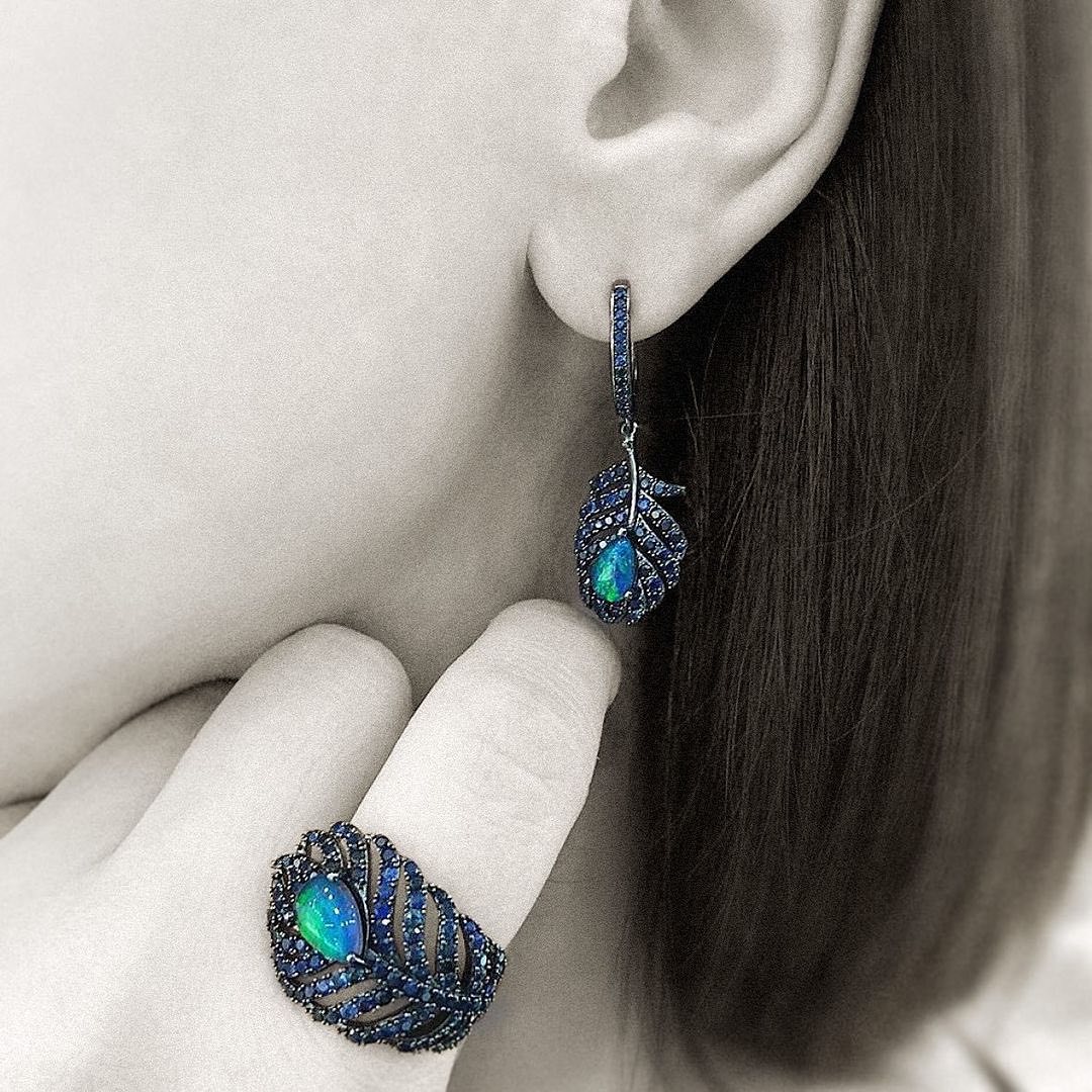 Серьги из серебра c сапфирами, опалом и тсаворитом