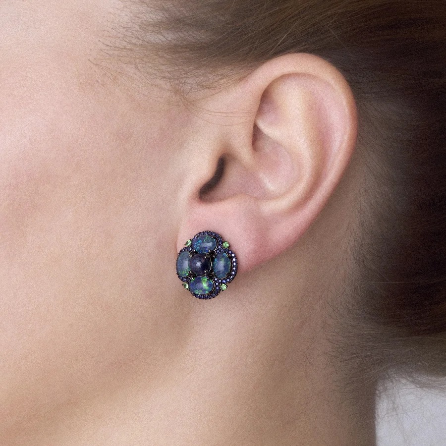 Серьги из серебра c сапфирами, опалом и тсаворитом